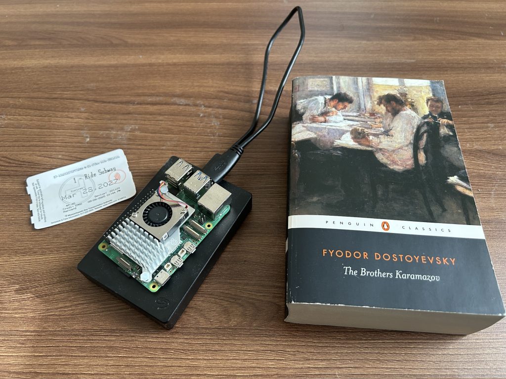 This, too, is a server. It sits on my bookshelf, taking up less space than my copy of The Brothers Karamazov. It makes no sound at all, and costs maybe a dollar or two a month in electricity. I bought it for less than a hundred dollars, and this page you’re reading is running on it. Other things that run on it include cloud storage for my friends and family, an online office suite (like Google Docs) to make that storage useful, and a private streaming service (think Netflix or Spotify) for my collection of music, TV, and movies.